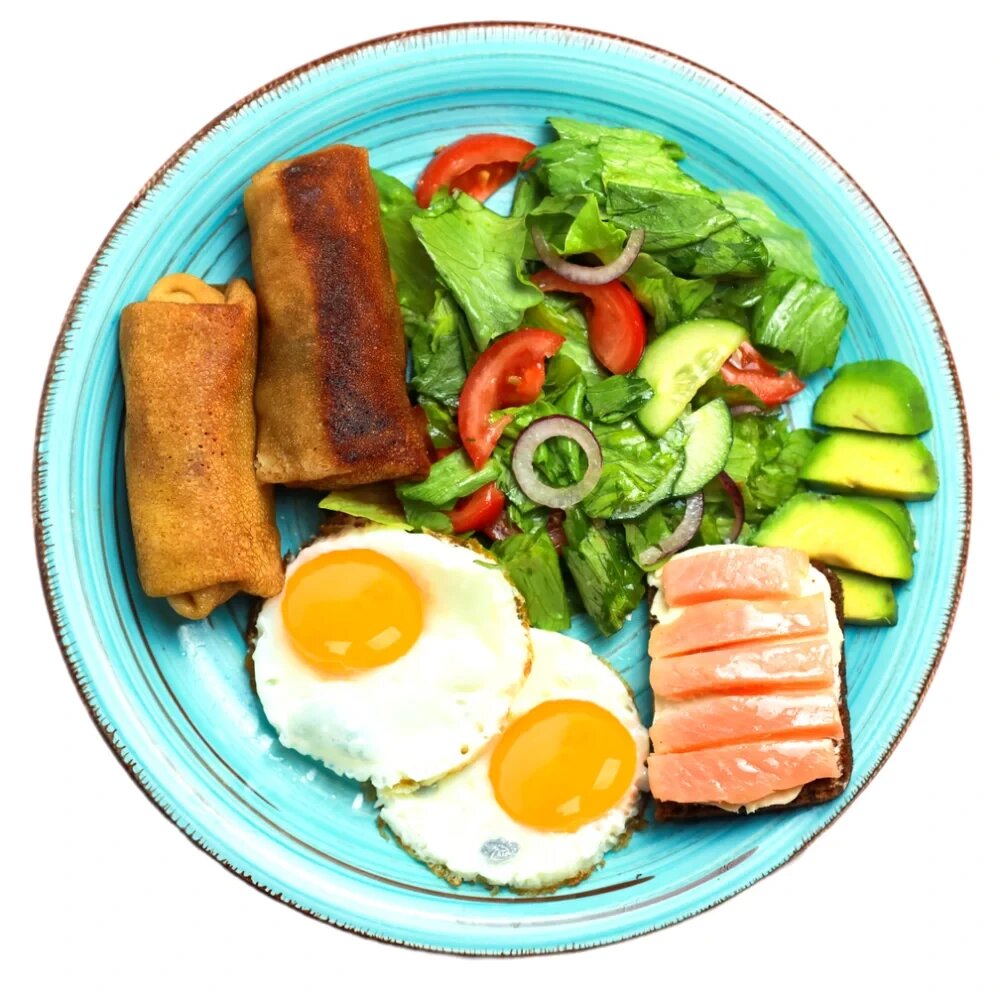 Яйцо, блинчики с начинкой, лосось, авокадо, сливочное масло, зелень, хлеб ржаной, соус песто.