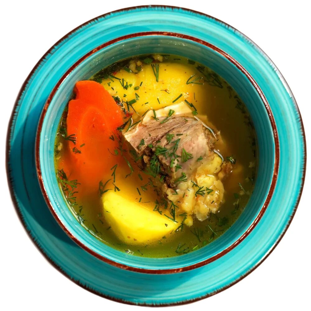 Ароматный восточный суп на мясном бульоне с крупными кусками баранины, картофелем и морковью.