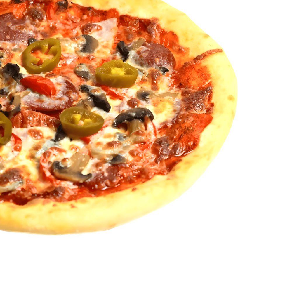 Пицца-соус, ветчина, пепперони, шампиньоны, томаты, сыр моцарелла, сыр брынза.