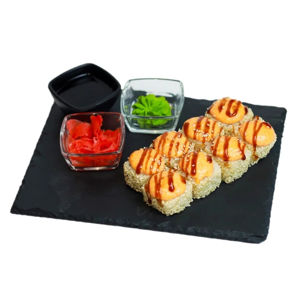 Нори, рис, сыр, огурец, лосось, майонез, соус унаги, соус кимчи, кунжут.
